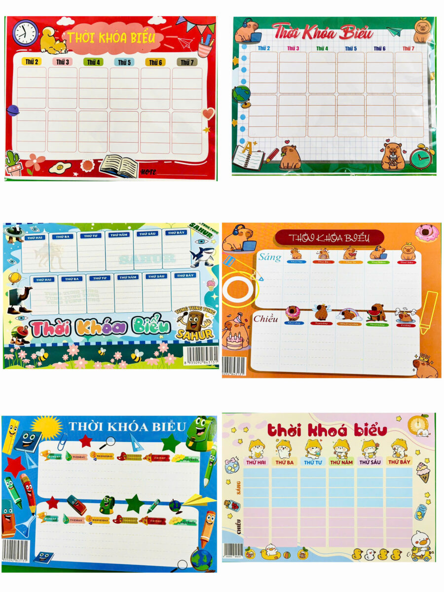 Tờ khóa biểu cho bé là bảng sắp xếp thời gian học tập theo từng ngày trong tuần, giúp học sinh dễ dàng theo dõi môn học, giờ học và hoạt động hằng ngày. Sản phẩm thường được thiết kế nhiều màu sắc, hình ảnh sinh động, phù hợp với lứa tuổi học sinh tiểu học và mầm non.